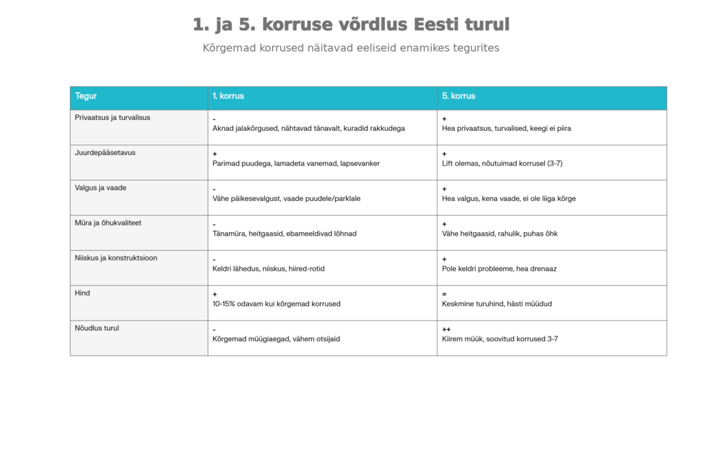 | Kui palju on 1. korrus odavam? | Tavaliselt 10-15% võrreldes kõrgemate korrustega |